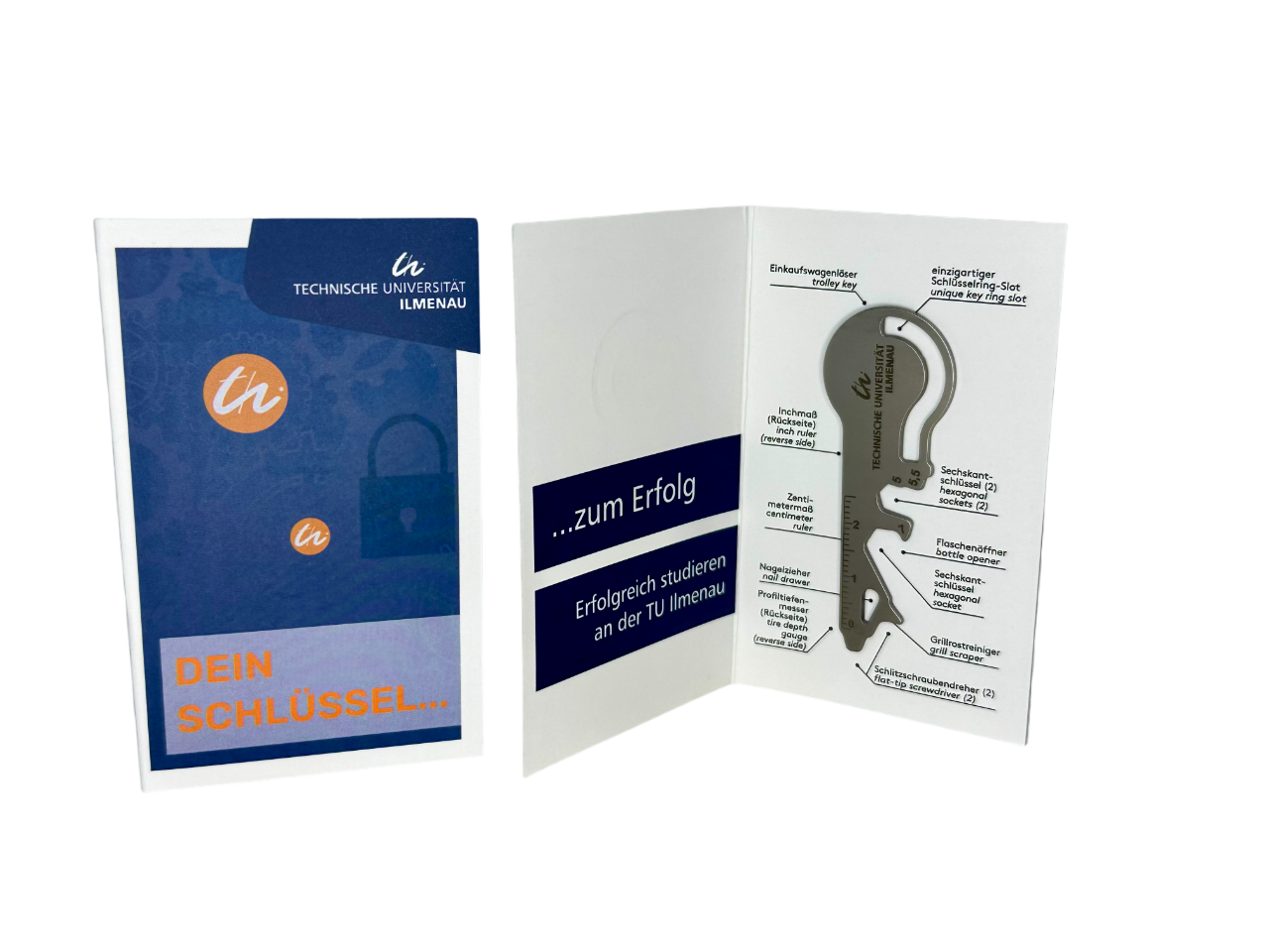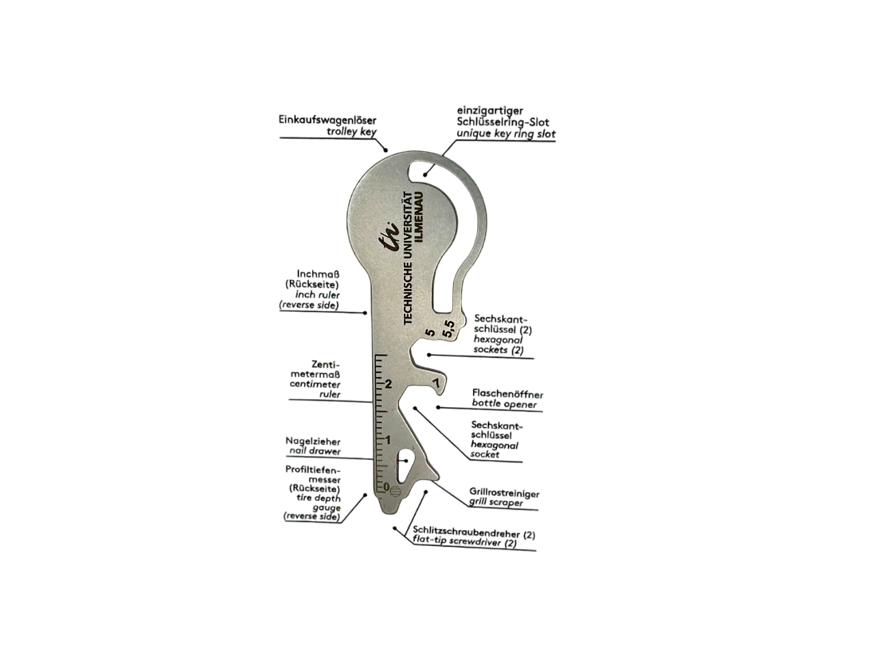 Dein Schlüssel zum entspannteren, leichteren Alltag! Und das darfst Du gleich mehrfach wörtlich nehmen: Der SUPER KEY „TU Ilmenau“ kommt in Schlüsselform daher, ist ultraflach und handlich. Mit seinen leichtgewichtigen 8 Gramm ist er nahezu unbemerkt überall dabei. Positiv bemerkbar macht er sich dann bei vielen Alltagsherausforderungen - mit Einkaufswagenlöser, Flaschenöffner, Schraubendreher und vielem mehr. Seine flache Schlüsselform macht das kompakte Multitool zum perfekten Begleiter am Schlüsselbund.